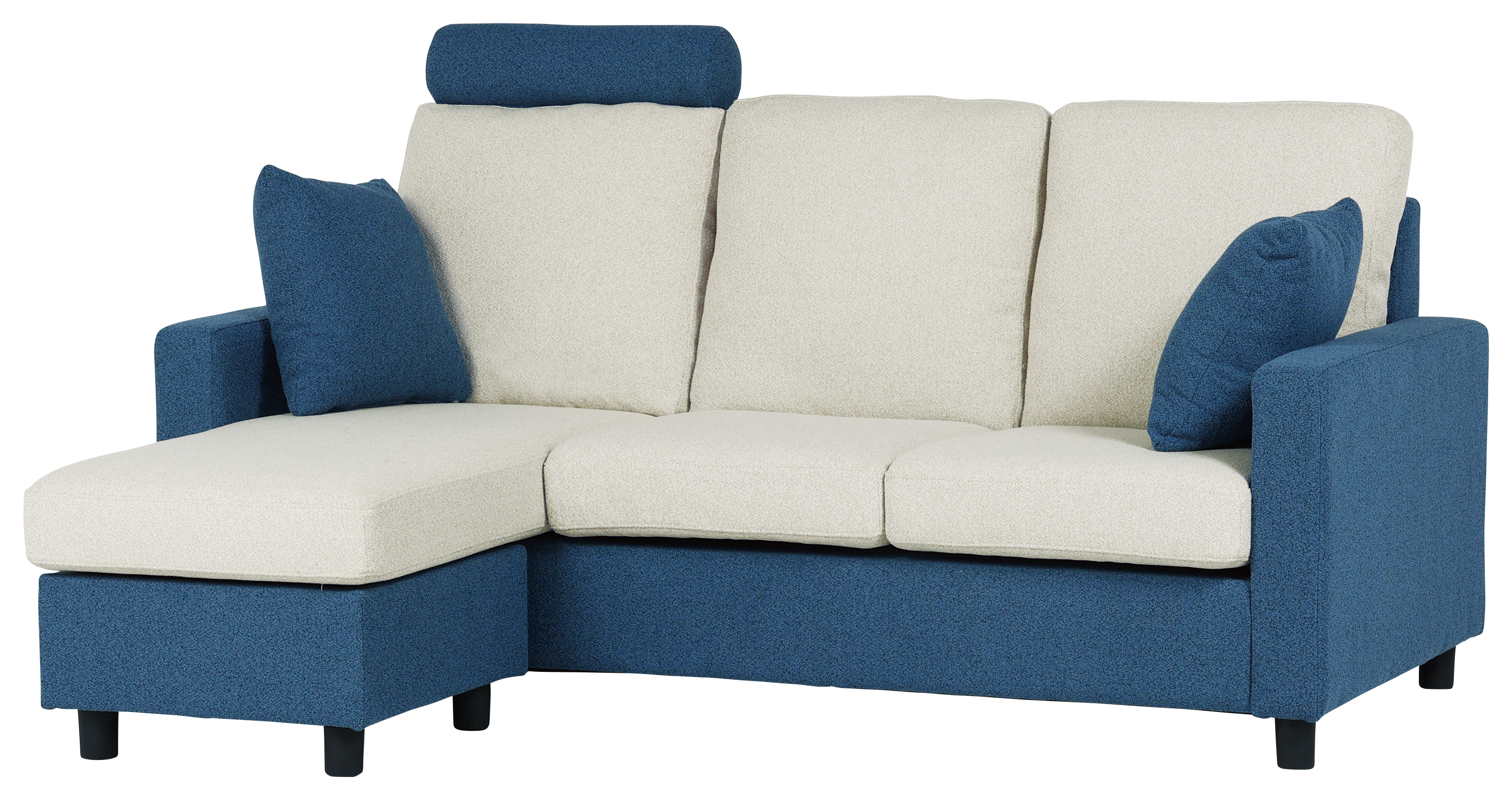 ヘッドレスト1個とハンドクッション2個付きです。ツートンカラーのおしゃれなソファです。